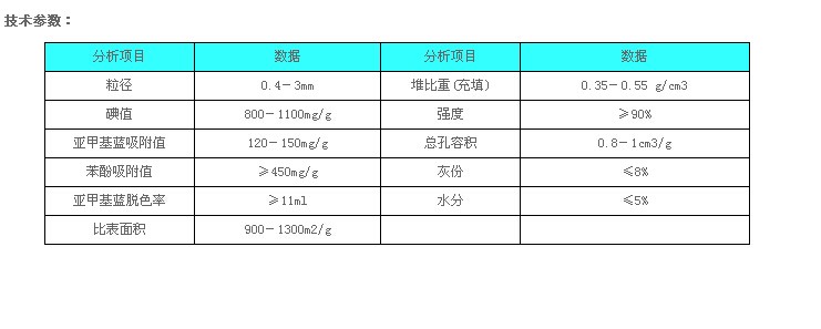 在煤質(zhì)活性炭中,褐煤活性炭比無煙煤活性炭具有較多的過渡孔隙及較大的平均孔徑,因此能有效地除去水中大分子有機物。一般在水處理中使用的活性炭,其表面積不一定過大,但是應(yīng)具有較多的過渡孔隙及較大的平均孔徑。日本市埸售一些液相用的活性炭具有以下特性:比表面積為850至1000m2/g,孔隙容積為0.88至1.5ml/g,平均孔隙半徑為40至50A。
